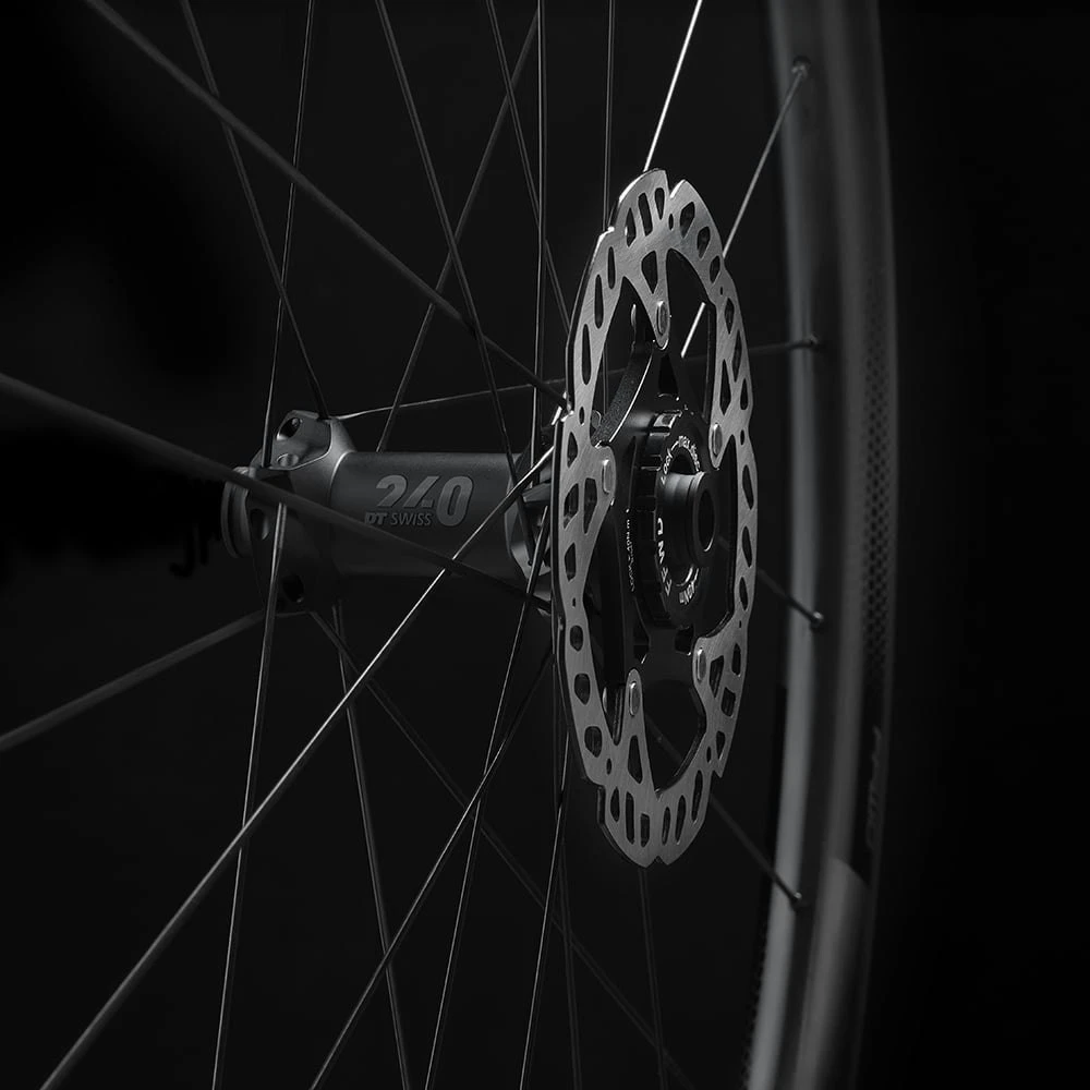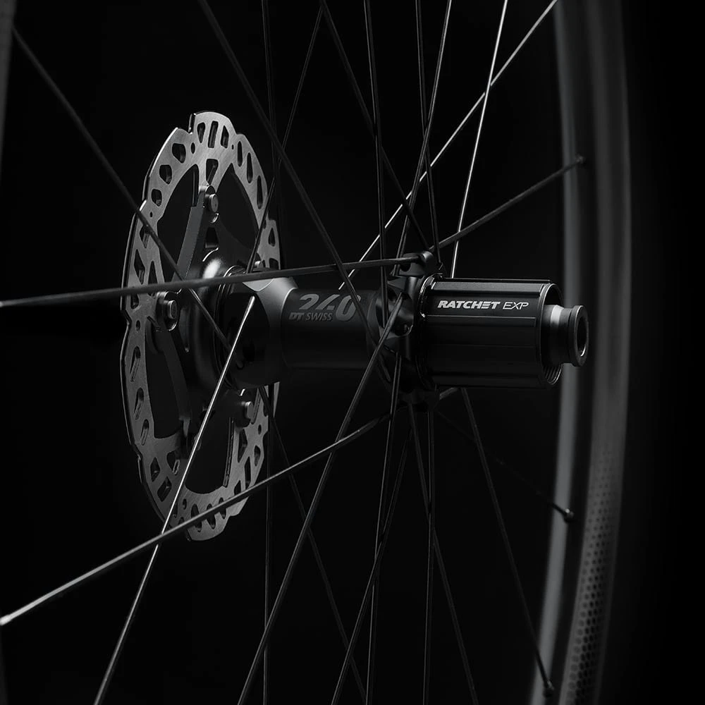 The RYOT33 is built with DT Swiss’ newest DT240 EXP straight pull center-lock hubs featuring a 36 tooth star ratchet system offering 10 degrees of engagement for quick and crisp shifting, DT Swiss Aerolite and Competition spokes, DT Swiss brass nipples and 12mm thru axle (12/100mm, 12/142mm) as standard.