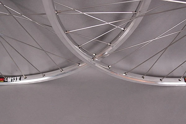 Sun M13 polished silver 27″ clincher rims – 36 DT spokes – freewheel hubs with the rear spaced at 126mm for multi speed freewheels 5, 6 and 7 speed.